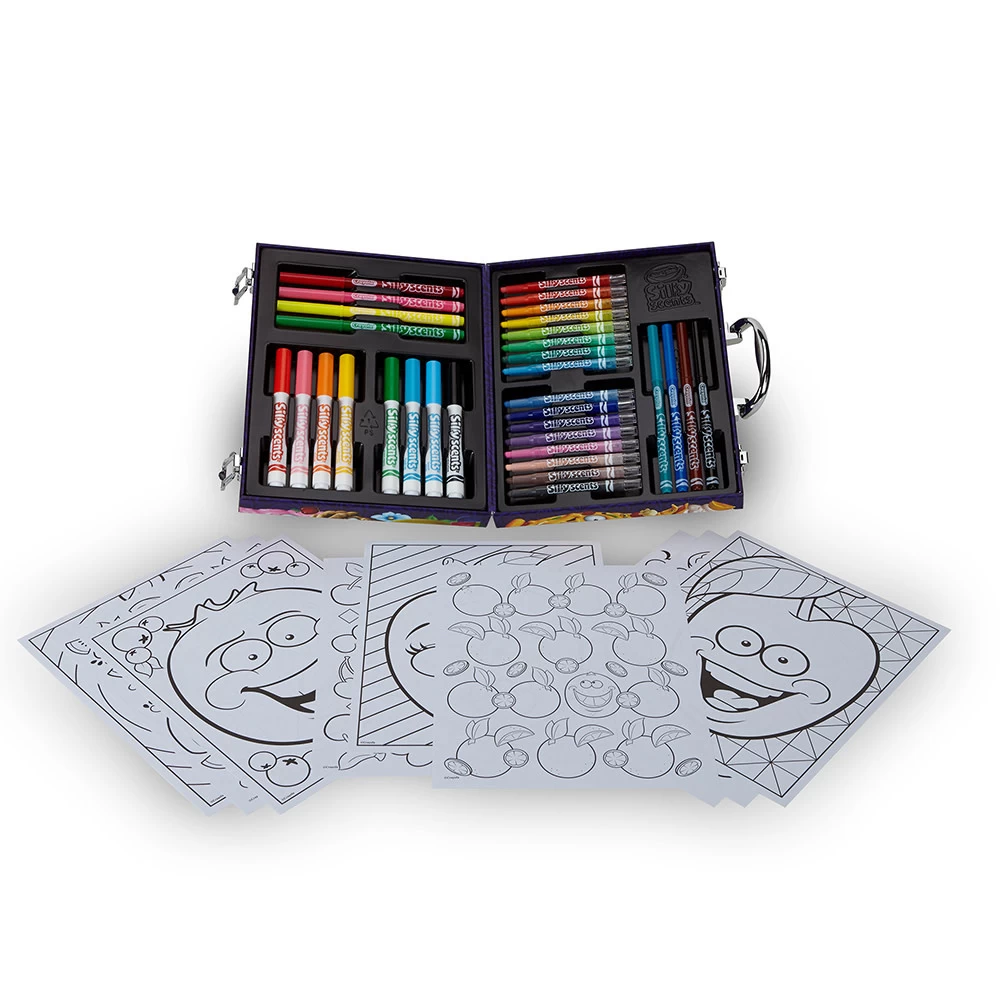 - 16 crayons mini Twistables, 8 marqueurs à trait fin, 8 marqueurs à trait large, 20 pages à colorier et une mallette de rangement.