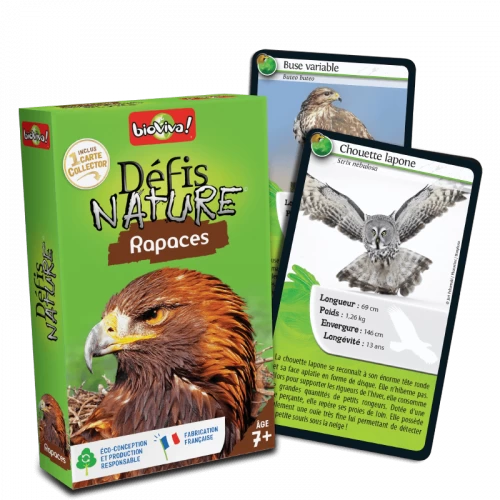 Défis Nature vous emmène à la rencontre des rapaces les plus surprenants de notre planète. Découvrez les espèces à préserver, puis pariez sur les points forts de vos oiseaux pour collecter toutes les cartes du jeu et remporter la partie.