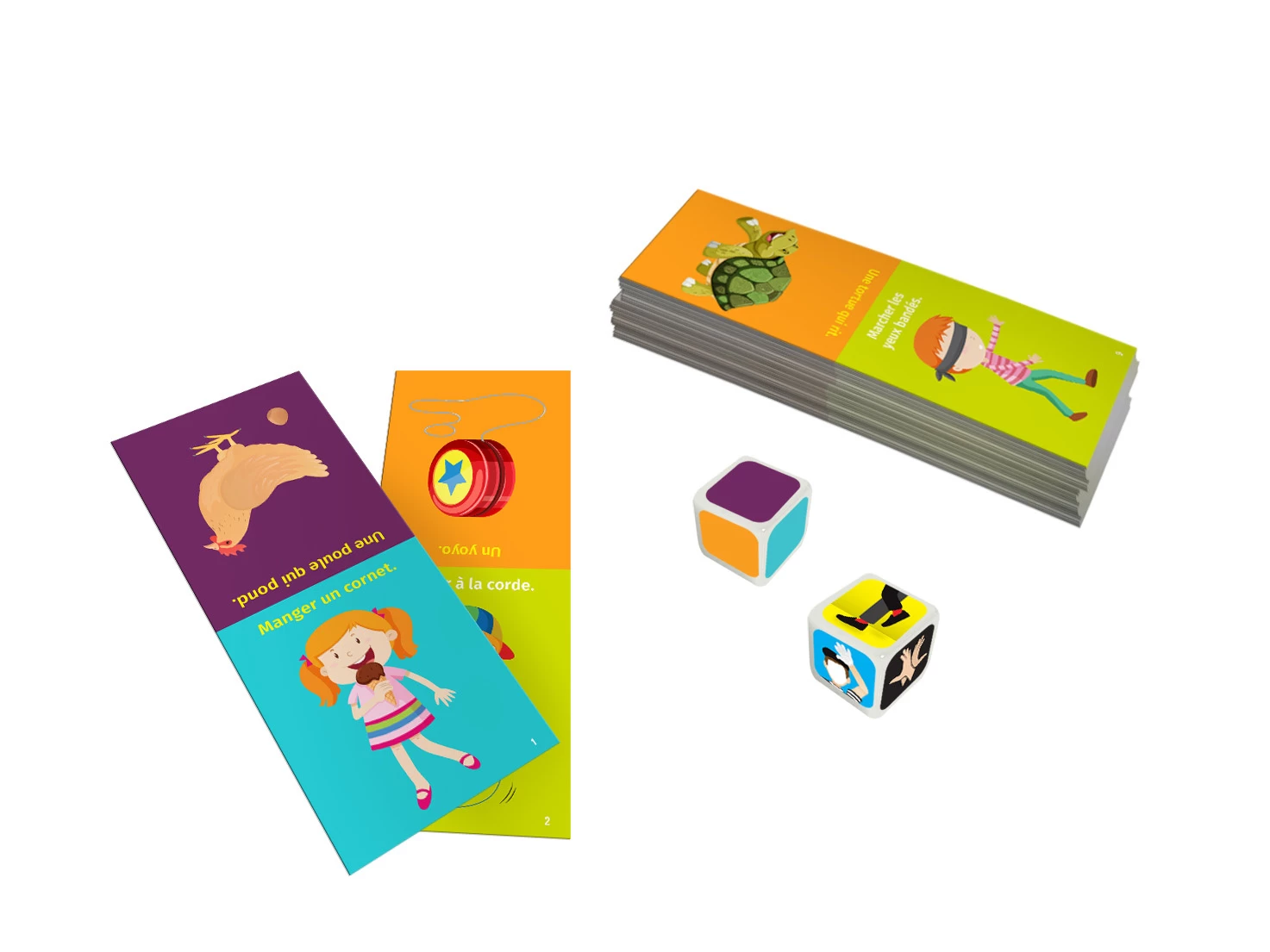 Lancez le dé de couleurs, il indiquera l’image que vous devez mimer. Pour encore plus de rires, ajoutez le dé de contraintes et mimez sur une jambe, les pieds croisés, un bras en l’air ou encore mimez en sautillant. Le joueur qui devine le plus grand nombre d’images gagne la partie.