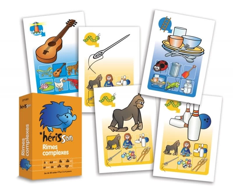 L’élève doit regrouper les cartes d’une même famille, composée de mots se terminant par le même son (rime). Différentes variantes des règles du jeu sont proposées, afin que vous puissiez adapter la difficulté du jeu au niveau des enfants.