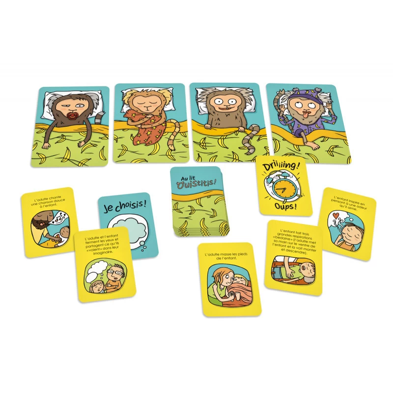 C’est l’heure du dodo pour les petits ouistitis! Avec papa ou maman, aide-les à s’endormir en posant des gestes calmes et affectueux comme flatter les cheveux ou chanter une chanson douce. Mais attention de ne pas les réveiller, car il faudra tout recommencer! Au lit ouistitis! est conçu pour favoriser une relation parent-enfant positive à travers des expériences amusantes et tout en douceur. Il permet aux enfants de 3 à 7 ans de passer un moment privilégié avec un de leurs parents en réalisant différents gestes d’attention et d’affection qui peuvent être intégrés au quotidien et à la routine du dodo.