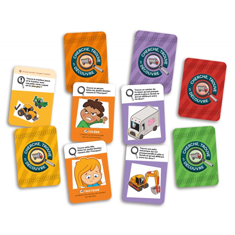 Cherche, trouve et découvre : les camions a été conçu pour soutenir le développement global de l’enfant de 3 ans à 4½ ans. Les différents jeux l’amènent à reconnaitre de petits ensembles d’objets, à nommer des émotions et leurs causes, à comprendre des consignes portant sur les couleurs et la taille des objets, et à développer ses habiletés sociales.