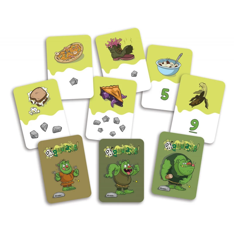 DÉgeulasse! est conçu pour aider les enfants de 3 ans à 9 ans et demi à developper leur compréhension des nombres et leurs habiletés de calcul. Les joueurs doivent lancer des dés pour donner des collations dégoutantes à des ogres en vue de les apprivoiser.