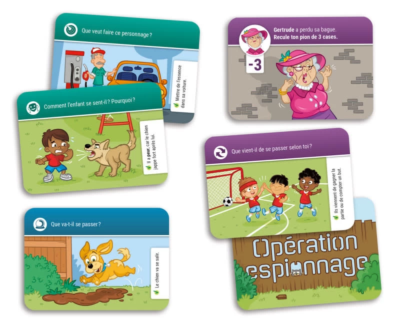 Opération espionnage est conçu pour solliciter chez l’enfant de 3½ ans à 6½ ans l’habileté à faire des inférences, soit déduire des informations qui ne sont pas fournies explicitement dans une situation. L’enfant répond à des questions qui portent par exemple sur le problème, le but, l’action ou l’émotion d’un personnage dans une situation donnée. Il s’habitue ainsi à faire des inférences, une habileté qui lui sera notamment utile à l’école pour comprendre des textes.