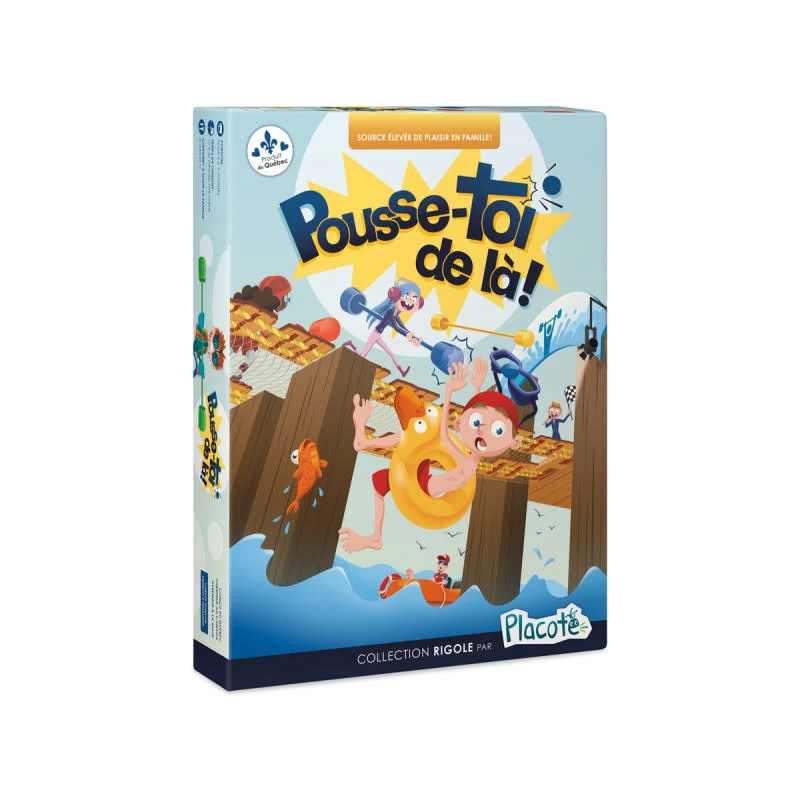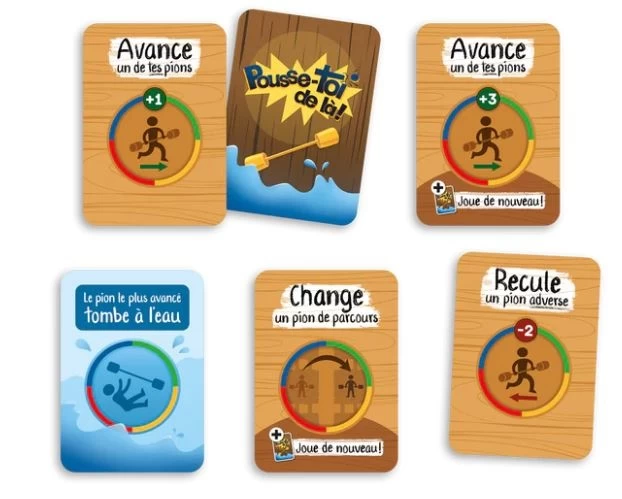 Pousse-toi de là! est un jeu de parcours familial dans lequel les joueurs s’affrontent dans une course en hauteur. Les joueurs tournent des cartes-actions qui font par exemple avancer un de leurs pions, reculer le pion d’un adversaire ou changer un pion de parcours. Chaque fois qu’un pion arrive sur la même case que le pion d’un adversaire ou en dépasse un, le joueur pousse le pion adverse en bas du plateau de jeu (il le «pousse à l’eau»!). Le joueur qui parvient à amener deux de ses pions à l’arrivée en premier remporte la partie. Êtes-vous prêts à prendre part à cette course rocambolesque?