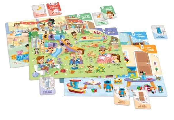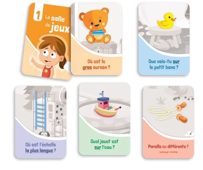 À vos marques, prêts, cherchez! Où est le gros ourson? Qui est à côté de la maison de poupée? Que vois-tu devant le coffre? Pour savoir quel objet ou quel personnage chercher, écoute attentivement la question de papa ou maman. Tu peux aussi partir à la recherche des objets qui sont sur les cartes « Cherche partout »!