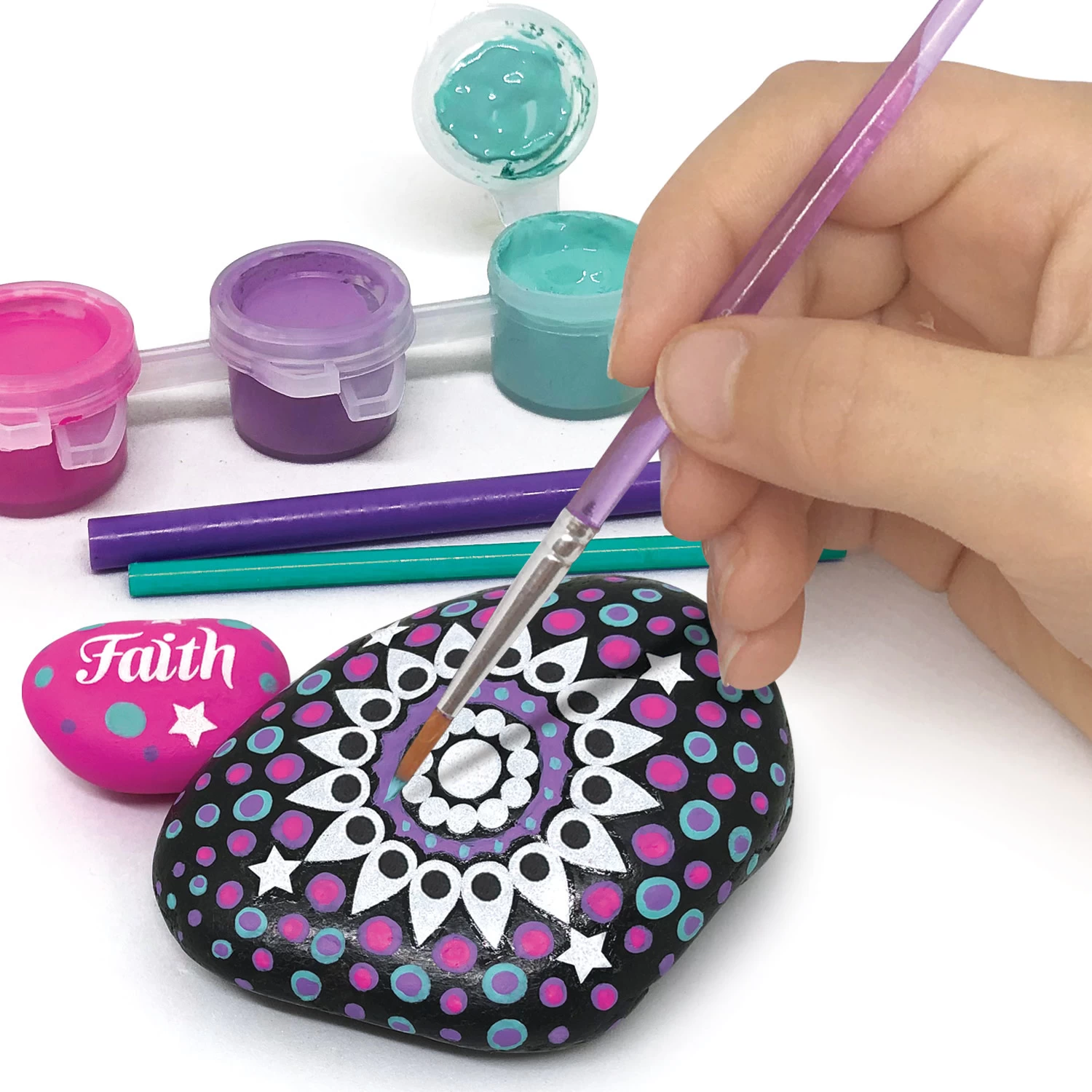 Voici 2 activités classiques rassemblées en un nouveau concept original: la peinture sur galets et le jardin zen japonais. Muni d’un grand plateau, de sable coloré et d’un mini râteau pour créer chaque jour des effets de galaxie différents. Décore 3 galets avec des transferts à frotter phosphorescents et de la peinture acrylique.